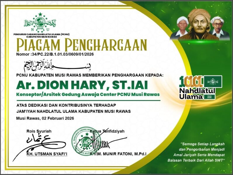 MUSI RAWAS – Dunia arsitektur di Kabupaten Musi Rawas kembali menorehkan kebanggaan. Ar. Dion Hary, ST. secara resmi menerima Piagam Penghargaan dari Pengurus Cabang Nahdlatul Ulama (PCNU) Kabupaten Musi Rawas atas kontribusi dan dedikasinya sebagai Konseptor sekaligus Arsitek Gedung Aswaja Center.